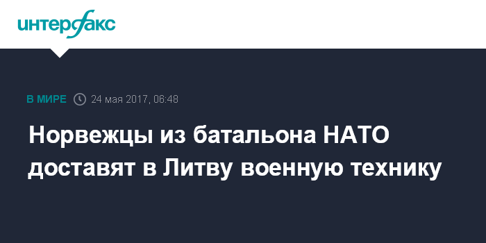 Москва. 24 мая. INTERFAX.RU - В Литву в среду прибудет военная и административная техника норвежского контингента, который служит в составе боевой группы батальона НАТО, предает агентство BNS. В республику прибудут около шестидесяти единиц техники, в том числе танки Leopard различных модификаций, боевые машины пехоты CV 90, БТР M113 различных модификаций, боевые и легкие транспортные средства, сообщило литовское министерство обороны.