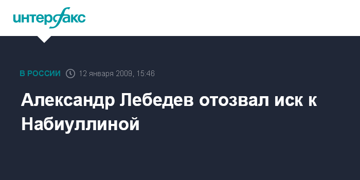 Москва. 12 января. INTERFAX.RU - Председатель совета директоров Национальной резервной корпорации Александр Лебедев отозвал судебный иск к главе Минэкономразвития Эльвире Набиуллиной за сутки до его рассмотрения в Московском городском суде.
