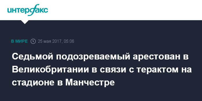 Москва. 25 мая. INTERFAX.RU - В Великобритании арестован седьмой человек в связи с терактом на стадионе "Манчестер Арена".