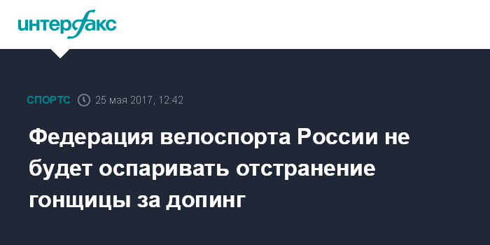 Москва. 25 мая. INTERFAX.RU - Федерация велосипедного спорта России (ФВСР) не намерена оспаривать дисквалификацию спортсменки Татьяны Антошиной, поскольку она подписала соглашение о признании нарушений и отказе от оспаривания санкций.
