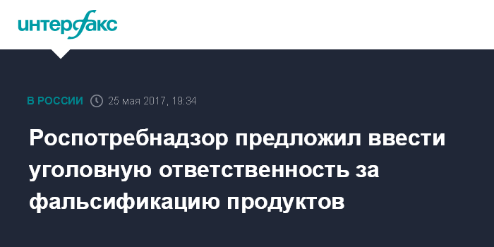 Москва. 25 мая. INTERFAX.RU - Роспотребнадзор подготовил законопроект, предусматривающий введение уголовной ответственности за фальсификацию продуктов, заявила глава ведомства, главный санитарный врач РФ Анна Попова.