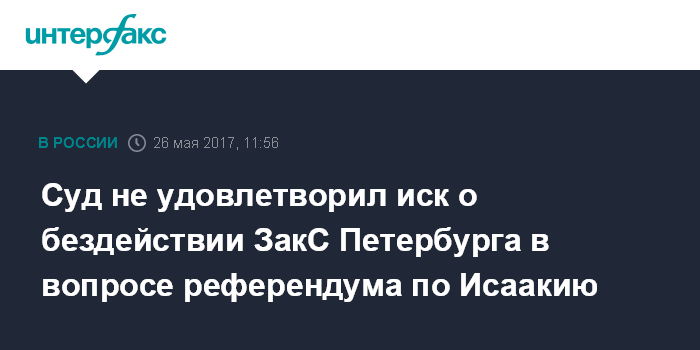 Москва. 26 мая. INTERFAX.RU - Октябрьский районный суд Санкт-Петербурга оставил без удовлетворения иск о бездействии Законодательного собрания по вопросу референдума о передаче Исаакиевского собора РПЦ.