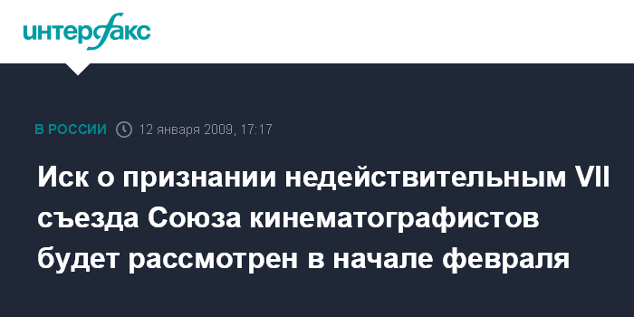 Москва. 12 января. INTERFAX.RU - Пресненский суд Москвы 6 февраля рассмотрит по существу иск о признании нелегитимным VII съезда Союза кинематографистов России.