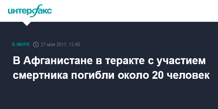 Москва. 27 мая. INTERFAX.RU - Не менее 18 человек погибли в результате нападения смертника на конвой сил безопасности в провинции Хост на востоке Афганистана, сообщает агентство Associated Press со ссылкой на афганское МВД.