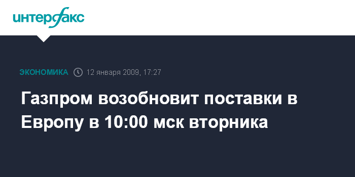 Москва. 12 января. INTERFAX.RU - "Газпром" возобновит поставки газа в Европу транзитом через Украину в 10:00 МСК во вторник, 13 января, заявил на пресс-конференции в Брюсселе зампред правления "Газпрома", генеральный директор "Газпром экспорта" Александр Медведев.
