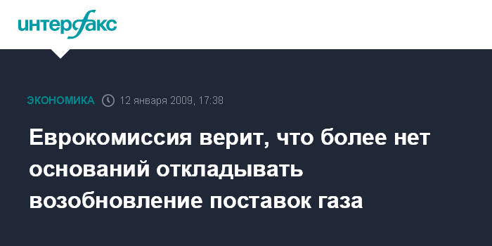 Москва. 12 января. INTERFAX.RU - Европейская комиссия верит, что более нет оснований для дальнейшего откладывания возобновления поставок газа в страны Европейского Союза. Об этом речь идет в сообщении Европейской комиссии, распространенном в понедельник в Брюсселе.
