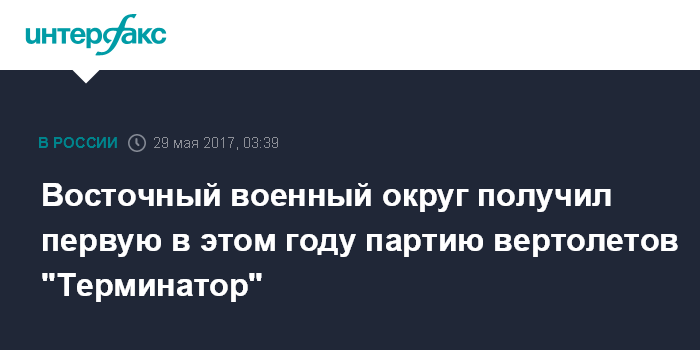 Москва. 29 мая. INTERFAX.RU - Восточный военный округ (ВВО) получил на вооружение первую в этом году партию транспортно-штурмовых вертолетов Ми-8АМТШ-ВА ("Терминатор").