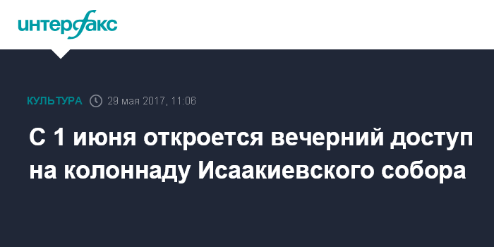 Москва. 29 мая. INTERFAX.RU - Колоннада Исаакиевского собора с 1 июня перейдет на летний режим работы, и на нее можно будет подняться ночью, сообщается на сайте государственного музея-памятника.