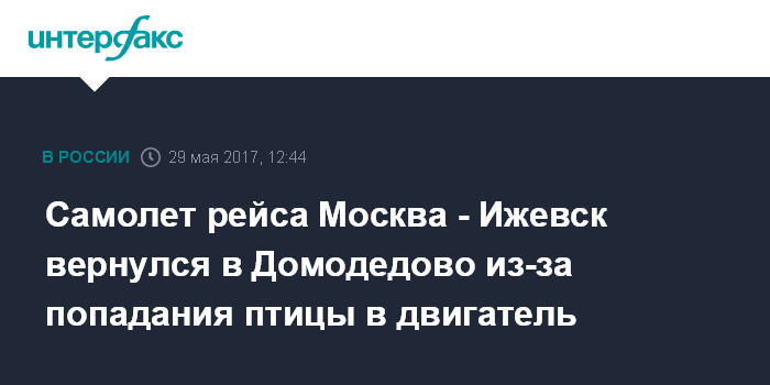 Москва. 29 мая. INTERFAX.RU - Вылет утреннего рейса авиакомпании "Ижавиа" сообщением Москва-Ижевск задержан на 4,5 часа в Домодедово из-за попадания птицы в двигатель самолета. Об этом сообщает пресс-служба авиакомпании в понедельник.