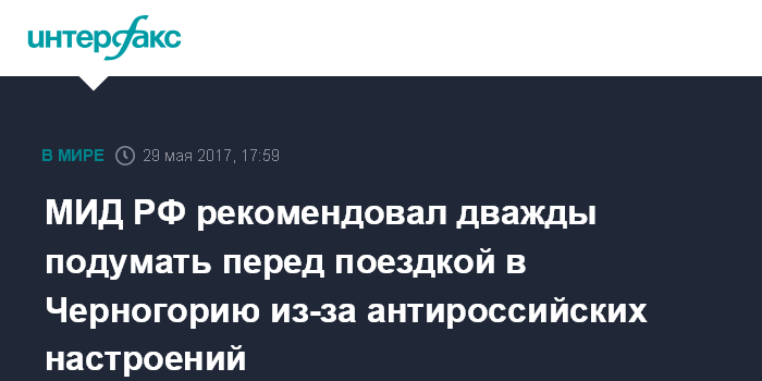 Москва. 29 мая. INTERFAX.RU - МИД РФ рекомендует россиянам "дважды подумать" перед поездкой в Черногорию в связи с негативными проявлениями в двусторонних отношениях.