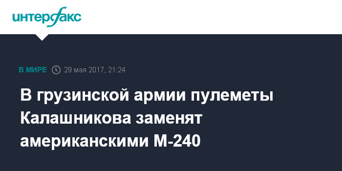 Москва. 29 мая. INTERFAX.RU - В грузинской армии пулеметы Калашникова советского производства с 30 мая будут поэтапно заменены на пулеметы натовских стандартов, в частности, М-240, которые находятся на вооружении армии США, сообщили журналистам в понедельник в Минобороны Грузии.