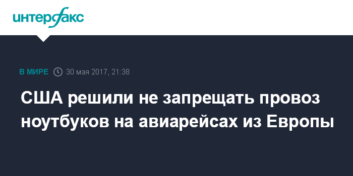 Москва. 30 мая. INTERFAX.RU - Администрация США и власти ЕС договорились не вводить запрет на провоз портативной компьютерной техники на авиарейсах из Европы в США, сообщает во вторник американское издание Politico.