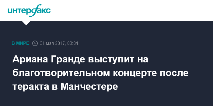 Москва. 31 мая. INTERFAX.RU - Американская певица Ариана Гранде споет на благотворительном концерте, где будут собирать средства для помощи жертвам и пострадавшим из-за теракта а Манчестере, сообщила BBC News.