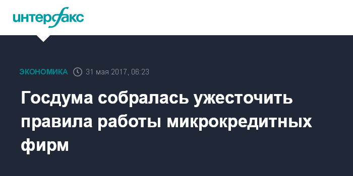 Москва. 31 мая. INTERFAX.RU - Госдума запланировала внести изменения в законодательство, которые сильно усложнят жизнь микрофинансовым компаниям, сообщил в среду "Коммерсант" со ссылкой на источники в правительстве.