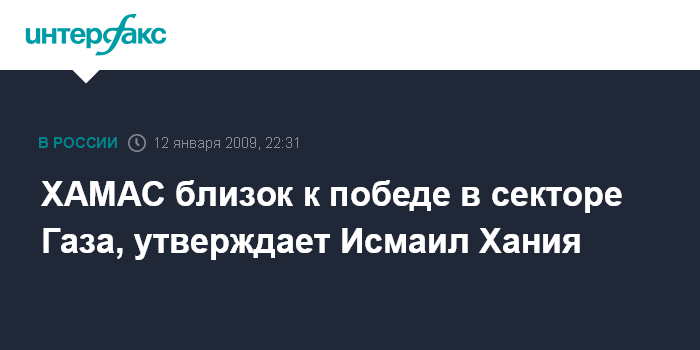 Иерусалим. 12 января. ИНТЕРФАКС - Палестинская группировка ХАМАС близка к тому, чтобы одержать победу над израильской армией, полагает руководитель администрации ХАМАСа в секторе Газа Исмаил Хания.