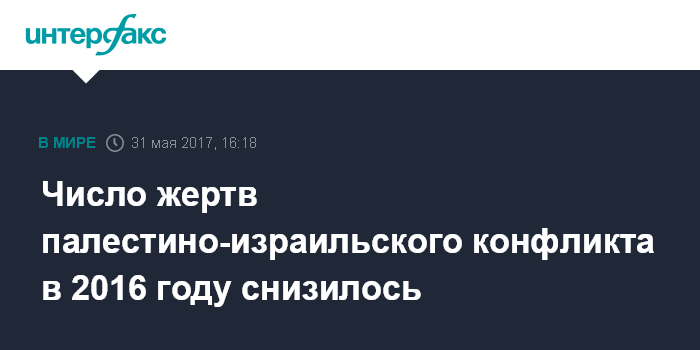 Москва. 31 мая. INTERFAX.RU - Число жертв палестино-израильского конфликта в 2016 году с обеих сторон снизилось, в то же время действия властей Израиля и Палестинской национальной администрации (ПНА) остаются основной причиной гуманитарных проблем на территориях ПНА, говорится в ежегодном докладе Управления ООН по координации гуманитарных вопросов (UNOCHA).
