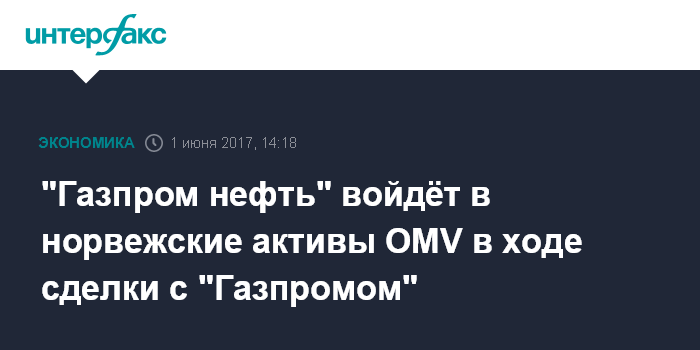 Москва. 1 июня. INTERFAX.RU - "Газпром нефть" войдет в норвежские активы OMV в ходе сделки с большим "Газпромом" , сообщил журналистам член правления "Газпрома" Всеволод Черепанов. "Актив OMV будет для "Газпром нефти" предоставлен. Он нефтяной", - сказал он.