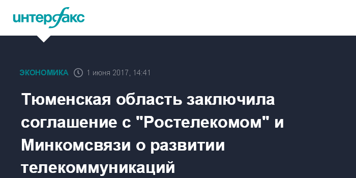Москва. 1 июня. INTERFAX.RU - Правительство Тюменской области, "Ростелеком" и Минкомсвязи РФ в четверг в ходе ПМЭФ-2017 заключили соглашение о сотрудничестве, сообщает пресс-служба губернатора области.