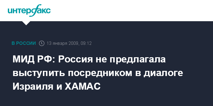 Москва. 13 января. INTERFAX.RU - В Москве опровергают сообщения израильских СМИ о якобы бы отвергнутом российском предложении о посредничестве между Израилем и ХАМАС.