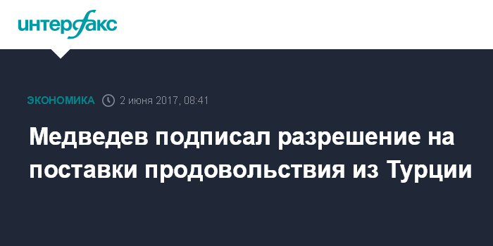 Москва. 2 июня. INTERFAX.RU - Глава правительства РФ Дмитрий Медведев подписал постановление о снятии ограничений на поставки продовольствия в Россию из Турции.