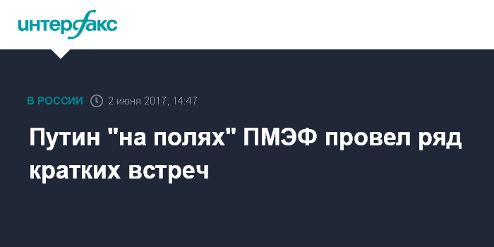 Москва. 2 июня. INTERFAX.RU - Президент РФ Владимир Путин "на полях" Петербургского международного экономического форума провел ряд кратких встреч.