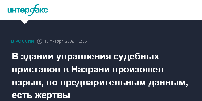 Москва. 13 января. INTERFAX.RU - В Назрани произошел взрыв неустановленного взрывного устройства в здании управления судебных приставов по республике Ингушетия, сообщили агентству "Интерфакс-Юг" в МВД Ингушетии.