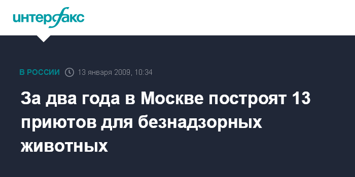 Москва. 13 января. INTERFAX.RU - В столице до конца 2010 года будет построено 13 приютов для безнадзорных животных, сообщили "Интерфаксу" в городской администрации во вторник.