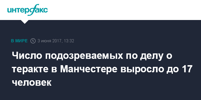 Москва. 3 июня. INTERFAX.RU - В Великобритании арестован еще один подозреваемый в причастности к совершению теракта на стадионе "Манчестер арена", жертвами которого стали 22 человека, сообщает в субботу газета The Daily Telegraph.