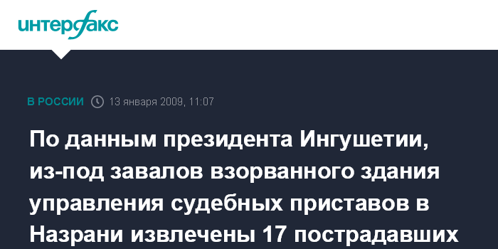 Москва. 13 января. INTERFAX.RU - Из-под завалов взорванного здания судебных приставов в Назрани извлечены 17 пострадавших, один из них находится в тяжелом состоянии, сообщил в интервью агентству "Интерфакс-Юг" во вторник президент республики Ингушетии Юнус-Бек Евкуров.