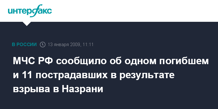 МЧС РФ сообщило об одном погибшем и 11 пострадавших в результате взрыва в Назрани
