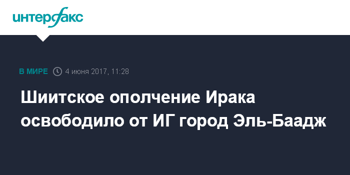 Москва. 4 июня. INTERFAX.RU - Шиитские формирования ополченцев выбили боевиков террористической группировки "Исламское государство" (ИГ, запрещена в РФ) из иракского города Эль-Баадж, расположенного на границе Ирака и Сирии, сообщает в воскресенье сайт ливанского издания The Daily Star.