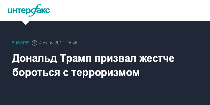 Москва. 4 июня. INTERFAX.RU - Президент США Дональд Трамп в связи с терактами в Лондоне призвал проявлять большую жесткость и приняться за обеспечение безопасности сограждан от террористов.