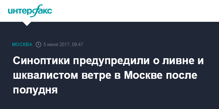 Москва. 5 июня. INTERFAX.RU - Синоптики предупреждают о резком ухудшении погоды после полудня понедельника. Как сообщили "Интерфаксу" в столичном метеобюро, с 12:00 до 21:00 в Москве ожидаются ливень и сильный ветер с порывами 15 метров в секунду и выше.