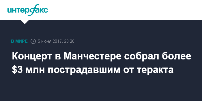 "Мы собрали невероятную сумму - 2,35 млн фунтов-стерлингов (более $3 млн - ИФ) за счет концерта One Love Manchester. Спасибо за ваши пожертвования", - говорится в сообщении, распространенном в твиттере организации.