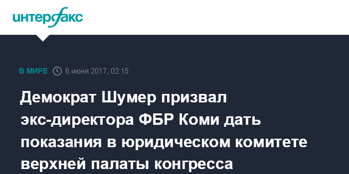 "Я надеюсь, что выступление Коми перед комитетом Сената по разведке не будет последним выступлением перед Конгрессом. Я знаю, что юридический комитет обратился в Коми с аналогичной просьбой. Я поддерживаю их просьбу и надеюсь, что он выступит перед ними", - приводит слова Шумера издание The Hill.
