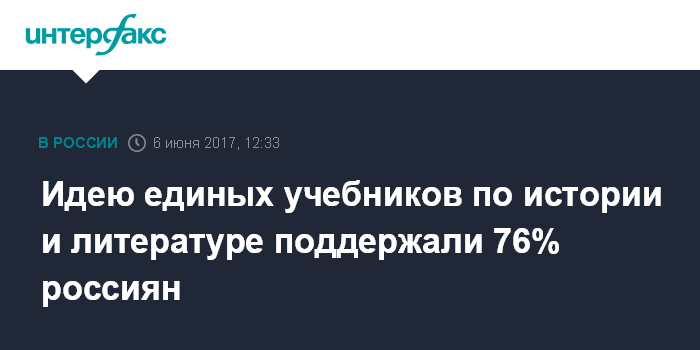 Москва. 6 июня. INTERFAX.RU - Три четверти россиян положительно относятся к планам создать единые школьные учебники по истории и по литературе (по 76%), каждый десятый не поддерживает эту идею (по 10%), сообщили "Интерфаксу" в "Левада-Центре".