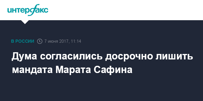 Москва. 7 июня. INTERFAX.RU - Госдума в среду согласилась досрочно прекратить депутатские полномочия титулованного теннисиста Марата Сафина по его просьбе. Соответствующий проект постановления нижняя палата поддержала на пленарном заседании.