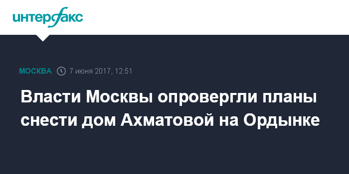 Москва. 7 июня. INTERFAX.RU - Мосгорнаследие опровергло информацию, распространяемую в социальных сетях, о намерении включить дом, в котором жила Анна Ахматова (Большая Ордынка, 17, строение 1), в программу реновации жилья и снести.