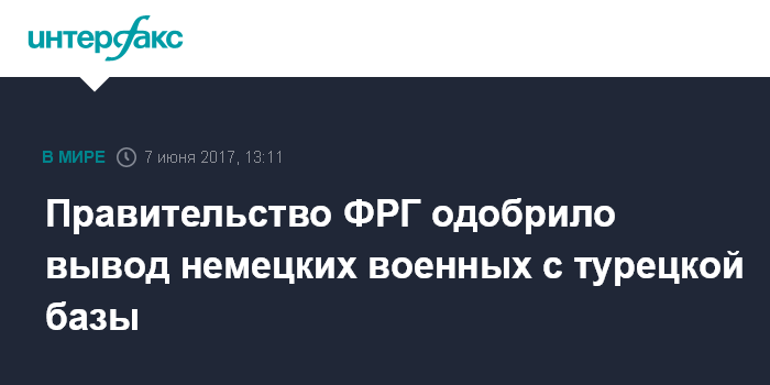 Москва. 7 июня. INTERFAX.RU - Правительство Германии поддержало решение о выводе немецких военных с турецкой авиабазы "Инджирлик", сообщают в среду немецкие СМИ.