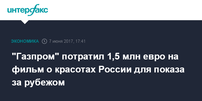 Москва. 7 июня. INTERFAX.RU - ООО "Газпром экспорт" заказало за 1,5 млн евро немецкой студии ColourFIELD GmbH документальный фильм о красотах России для демонстрации в телевизионном эфире и кинотеатрах стран Европы и мира.