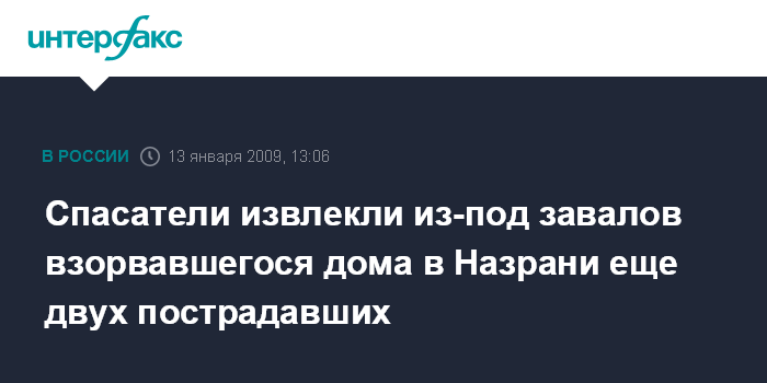 Москва. 13 января. INTERFAX.RU - Из-под завалов здания управления федеральных приставов Ингушетии в Назрани, в котором во вторник произошел взрыв, по данным на 12:40 мск, извлечены 23 человека, сообщили агентству "Интерфакс-Юг" в пресс-службе МЧС Ингушетии.