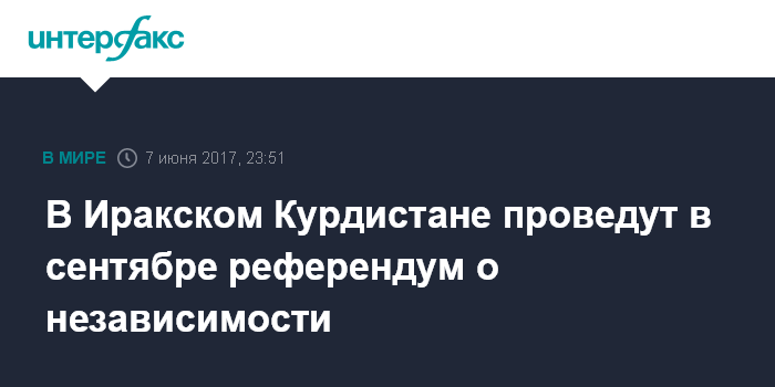 Москва. 7 июня. INTERFAX.RU - Власти Иракского Курдистана объявили в среду о решении провести 25 сентября 2017 года референдум о независимости от Багдада.