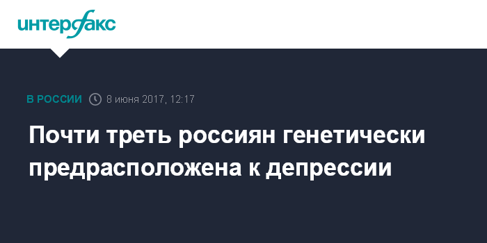 Москва. 8 июня. INTERFAX.RU - Почти треть россиян (30%) имеет ген, связанный с предрасположенностью к депрессиям и суицидальному поведению, свидетельствуют результаты исследования, проведенного медицинской компанией Genotek. Эксперты Genotek отмечают, что в формировании депрессии большую роль играют генетические факторы – показатели наследуемости этого заболевания составляют 37-38%. По данным компании, в настоящее время 10% всех людей в мире, обратившихся за медицинской помощью, страдают депрессией.