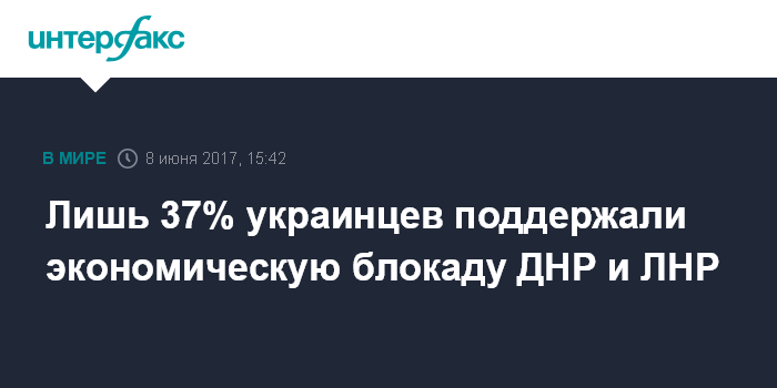 Москва. 8 июня. INTERFAX.RU - Примерно 37% украинцев не поддерживают экономическую блокаду неподконтрольных Киеву районов Донецкой и Луганской областей, свидетельствуют исследования "Динамика общественно-политических взглядов в Украине", проведенные с 21 апреля по 5 мая социологической группой "Рейтинг".