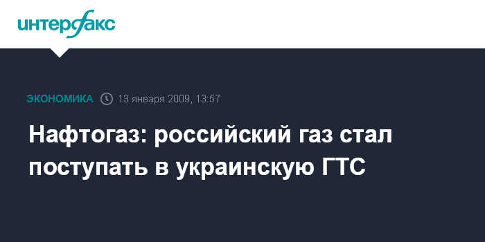 Москва. 13 января. INTERFAX.RU - Российский природный газ стал поступать в украинскую газотранспортную систему, сообщили агентству "Интерфакс" в Национальной акционерной компании (НАК) "Нафтогаз Украины" во вторник.