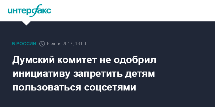 Москва. 9 июня. INTERFAX.RU - Профильный комитет Госдумы рекомендовал отклонить законопроект депутата Виталия Милонова, предусматривающий запрет на пользование социальными сетями для тех, кто младше 14 лет, и советовал автору повременить с повторным внесением аналогичной инициативы.