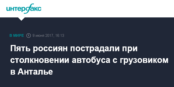 Москва. 9 июня. INTERFAX.RU - Автобус с 44 туристами столкнулся с грузовиком в турецкой Анталье, среди пострадавших есть российские туристы, сообщили в пятницу порталу "Интерфакс-Туризм" в генконсульстве России в Анталье.