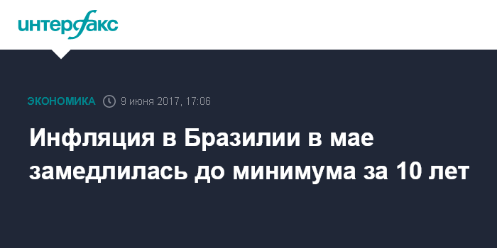 Москва. 9 июня. INTERFAX.RU - Инфляция в Бразилии в мае 2017 года снизилась до минимального уровня за 10 лет, свидетельствуют данные статистического агентства IBGE.