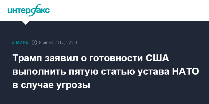 Москва. 9 июня. INTERFAX.RU - Президент США Дональд Трамп заявил о готовности США действовать согласно пятой статье (о коллективной обороне - ИФ) устава НАТО в случае возникновения военной агрессии в отношении одной из стран-участниц Североатлантического альянса.