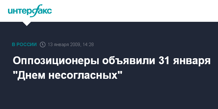 Москва. 13 января. INTERFAX.RU - Ряд оппозиционных организаций объявили 31 января "Днем несогласных". В частности, в заявлении, распространенном во вторник, фигурируют Объединенный гражданский фронт, "Смена", "Оборона", АКМ, Союз советских офицеров, так называемые нацболы и ряд других менее известных организаций.